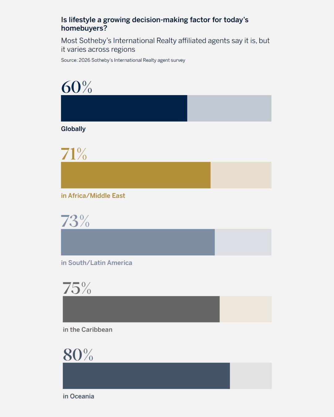 In the 2026 Sotheby’s International Realty agent survey, more than half (60%) of affiliated agents said that lifestyle had been a more important factor to luxury homebuyers than in previous years. The emphasis on lifestyle was particularly important to homebuyers in Oceania, the Caribbean, South and Latin America, and Africa and the Middle East.