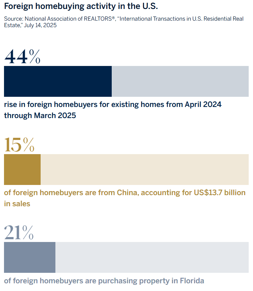 The U.S. remains a popular location for UHNWIs looking to buy a home. According to a July 2025 report by NAR on international residential transactions in the U.S., foreign homebuyer activity for existing homes increased by 44% from April 2024 through March 2025, the first year-over-year growth since 2017.19