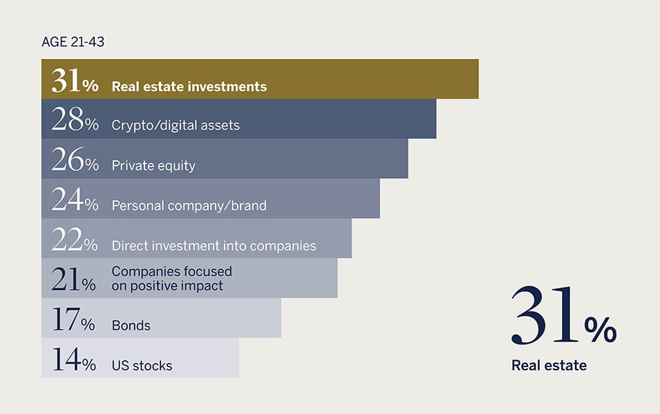 Among younger individuals, real estate represents the greatest opportunity for growth (31%), followed by cryptocurrency and other digital assets (28%), private equity (26%), a personal company or brand (24%), direct investments in companies (22%), companies focused on positive impacts (21%), bonds (17%), and U.S. stocks (14%).