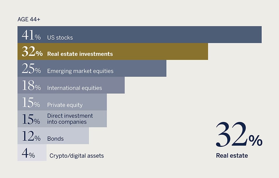 Individuals 44 and older prioritize U.S. stocks (41%), followed by real estate (32%), emerging market equities (25%), international equities (18%), private equity (15%), direct investment in companies (15%), bonds (12%), and cryptocurrency and other digital assets (4%).
