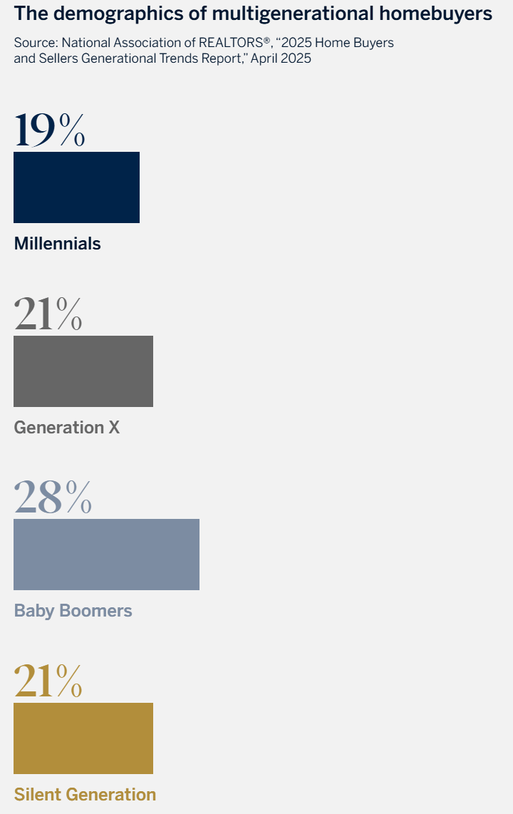 In 2024, an estimated 17% of U.S. homebuyers purchased a residence with the intent to house multiple generations, according to an April 2025 report by the National Association of REALTORS® (NAR).1 The report defines a multi-generational household as one that includes more than one adult generation, such as a couple living with their adult children or their own parents.