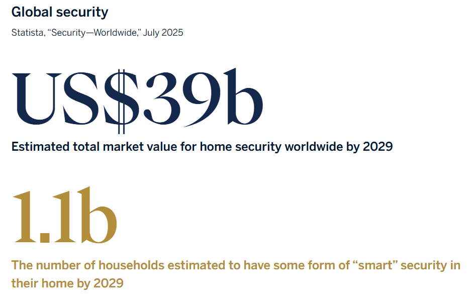 Such concerns aren’t limited to the U.S.—they are also fueling substantial growth in the global home security market. The worldwide spend on “smart” home security is estimated to reach US$39 billion by 2029, according to a July 2025 report by market research firm Statista, with the number of households having some form of “smart” security installed reaching an estimated 1.1 billion by 2029.3