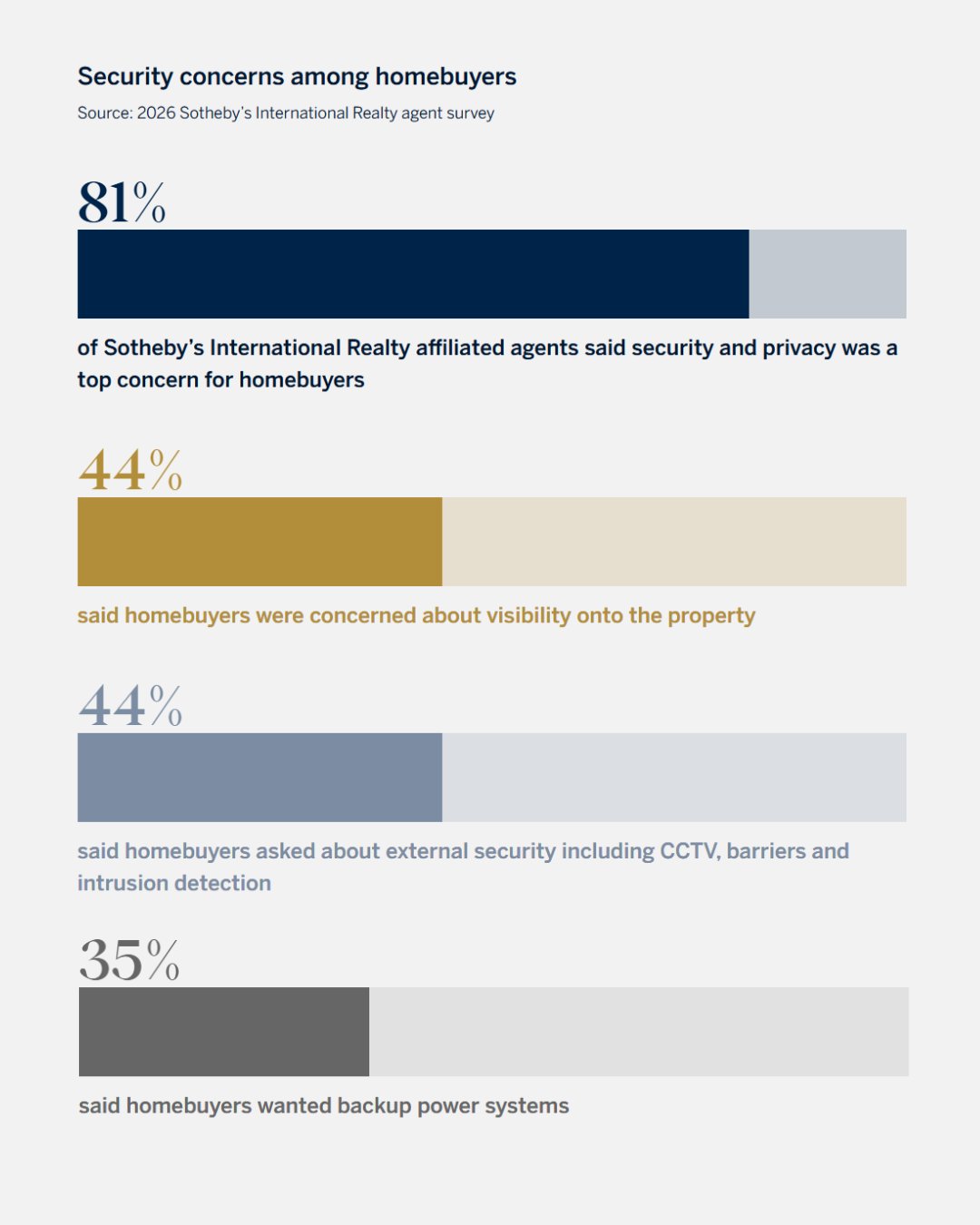 According to the 2026 Sotheby’s International Realty agent survey, visibility onto a property was high on the list of security and privacy considerations voiced by luxury homebuyers, with nearly 44% of respondents ranking it as the top concern among clients.